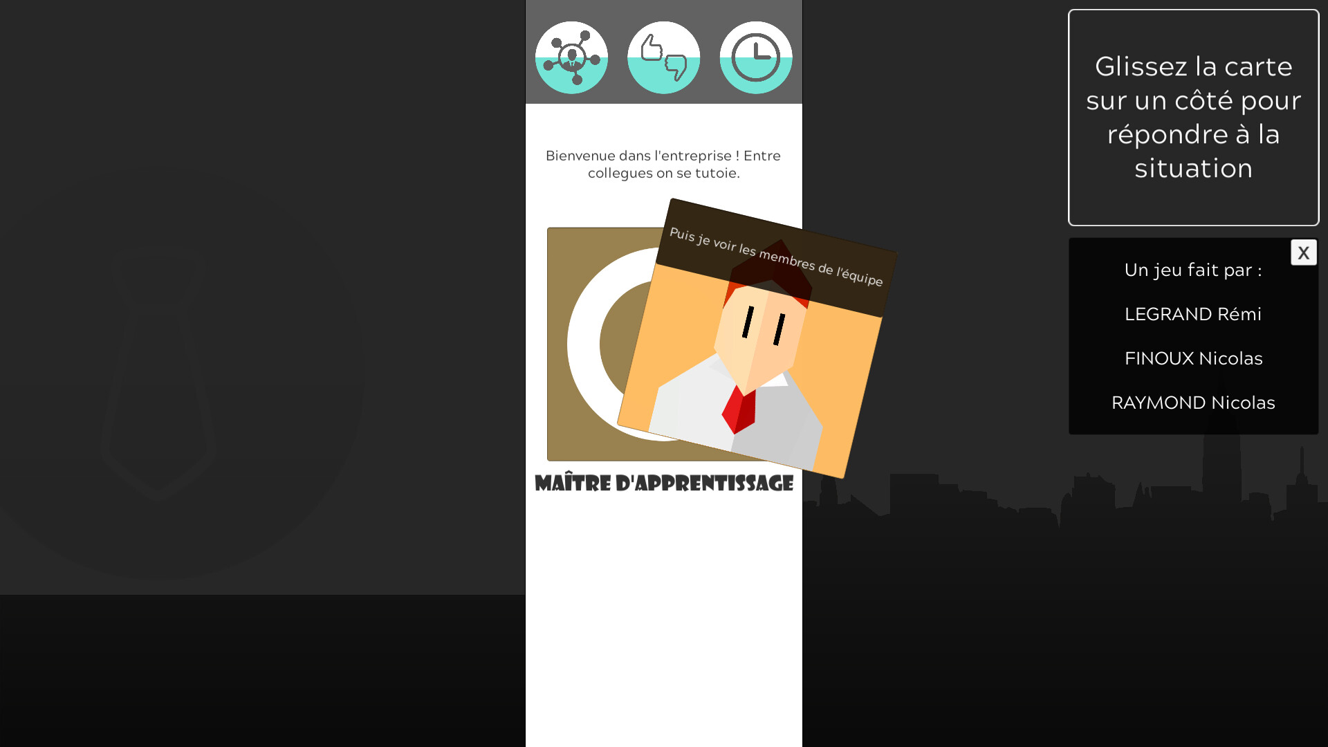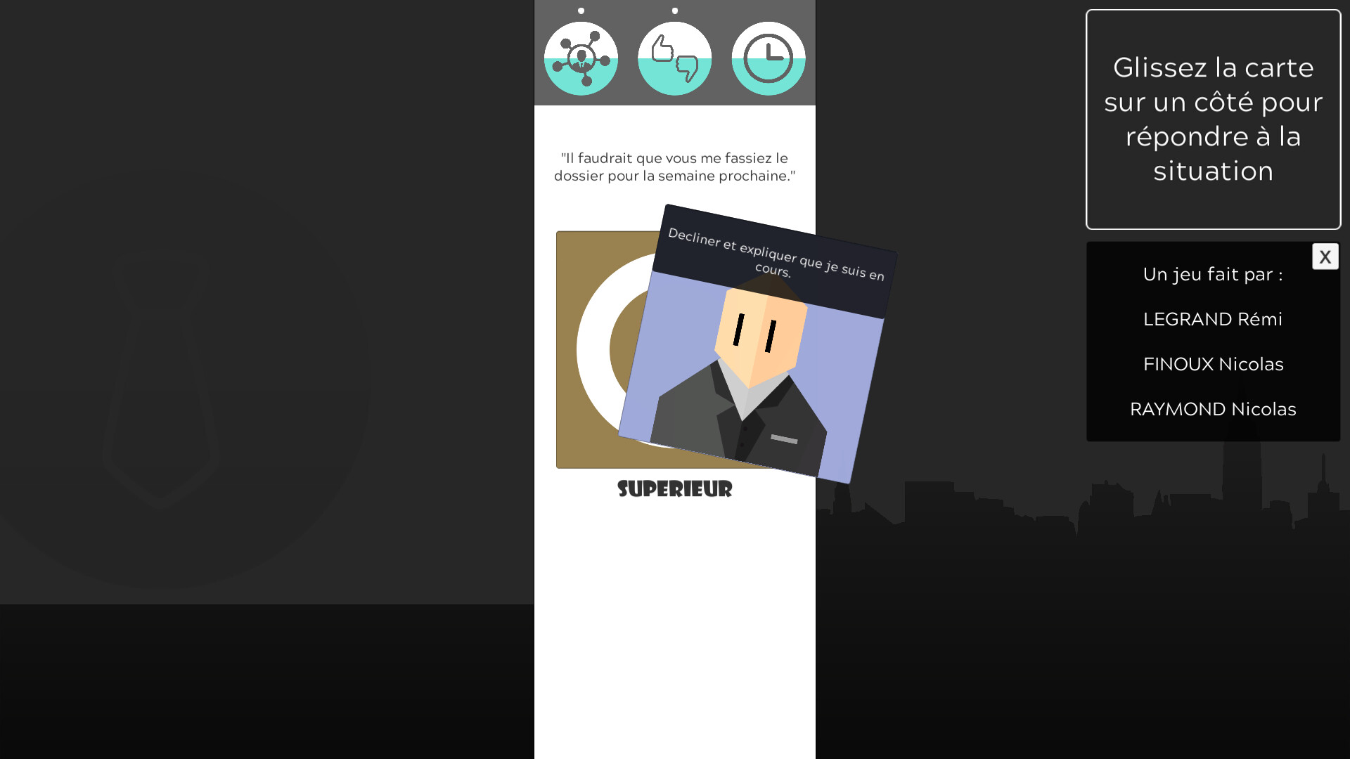 La façon de jouer à ce jeu est très simple, glisser une carte vers la gauche ou la droite avec la souris pour choisir une réponse à une situation. En fonction de votre réponse, vous pourriez changer les jauges de "social", "moral" et de "gestion du temps".