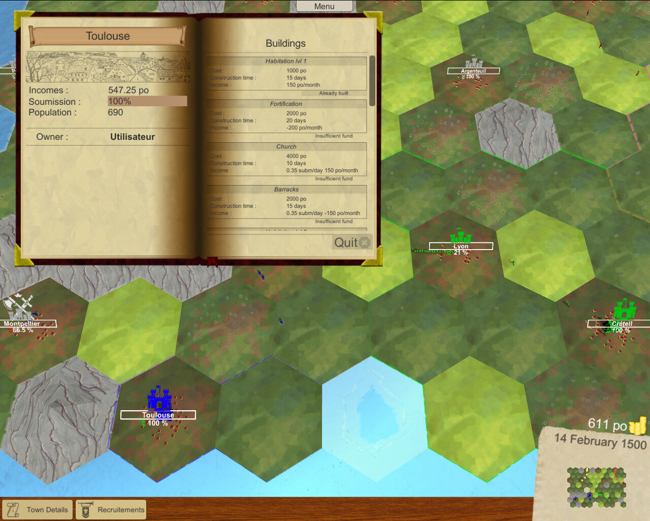 C'est un jeu de stratégie hexagonal dans lequel vous incarnez un tyran qui doit contrôler tout un continent. Ce territoire est constitué de villes qui peuvent être améliorées en construisant des bâtiments spéciaux, vous conférant de l'argent et du pouvoir !